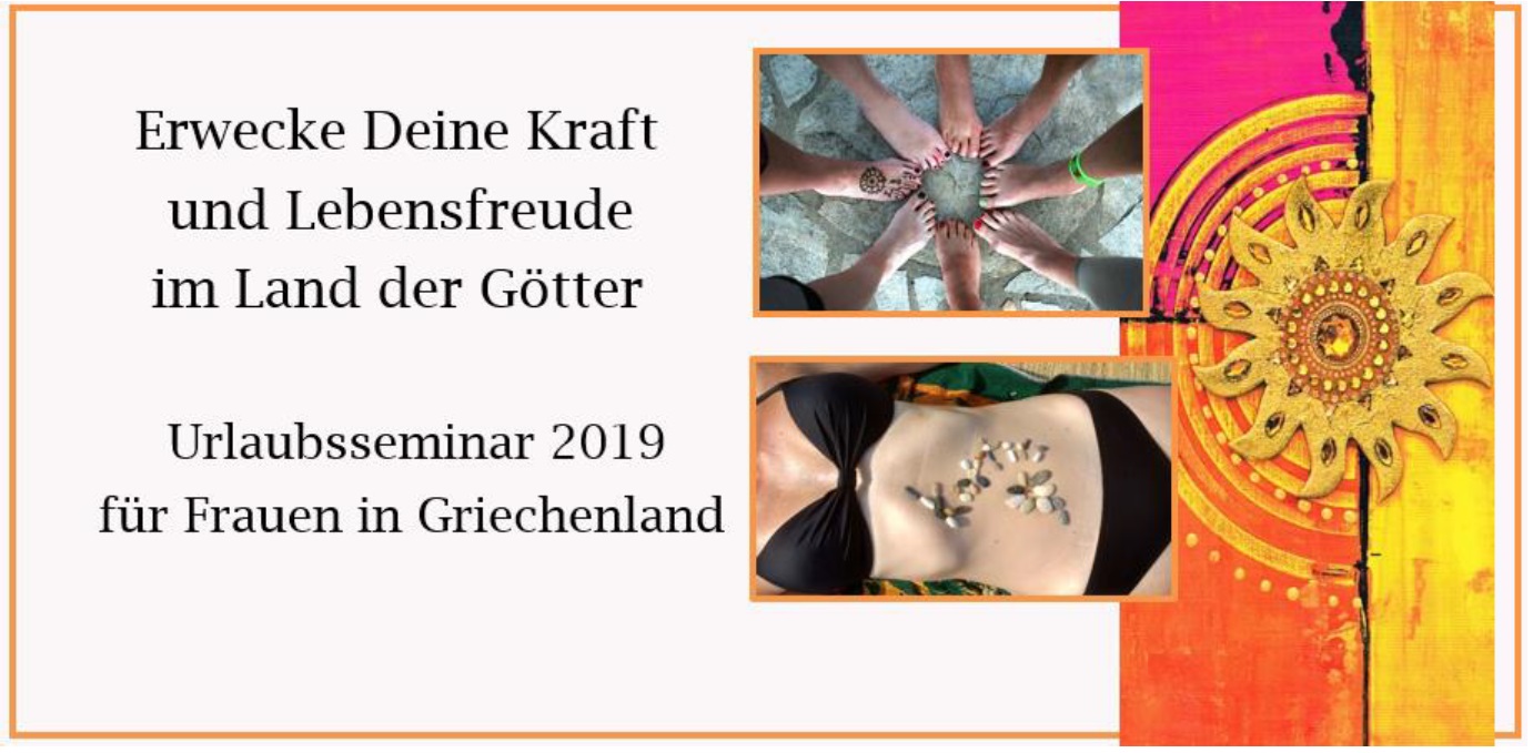 Seit fünf Jahren biete ich Urlaubsseminare in Griechenland für Frauen an. Im Land der Götter, inmitten eines Olivenhains mit Blick auf den heiligen Berg Athos, kannst du alles Müssen und Sollen hinter dir lassen. Verschiebe dein Leben, deine Lebendigkeit und deine Lebensfreuede nicht mehr auf später – spring hinein in ein kleines Abenteuer und sei so, wie du schon immer sein wolltest!