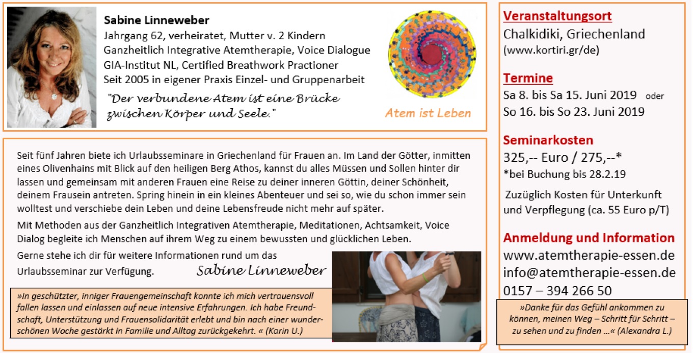 Gerne stehe ich für weitere Informationen rund um das Urlaubsseminar und der Atemarbeit zur Verfügung.